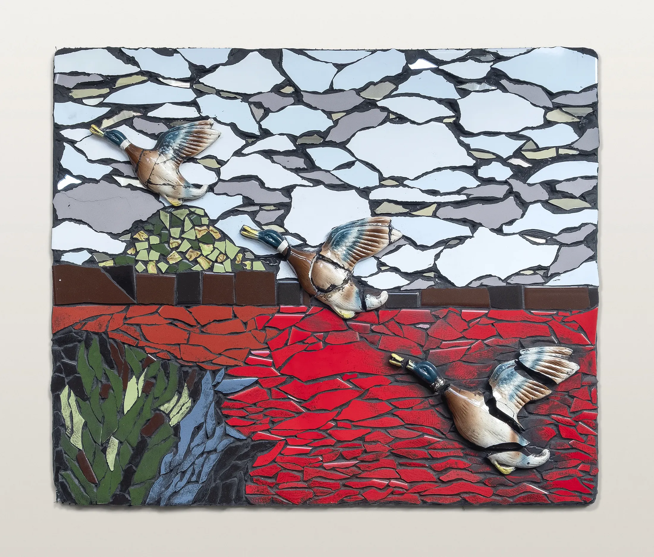 Now nearly two years sober, I see my large physical scars no longer as marks of shame, but as the grout holding my new life together. Here, the ducks map the start of my journey: sinking in the blood of the bottom, yet finally catching the light of the silver-lined clouds above—mirrored shards that invite you to see your own reflection in the light of recovery.