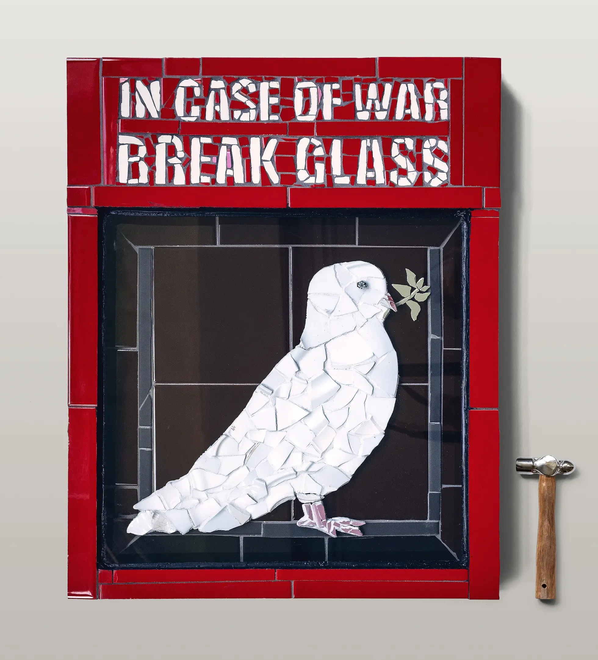 The emergency red box symbolises the rigid structures and generational expectations that once defined me. For 46 years, I lived by rules of "perfection" that weren't my own—even believing a simple tattoo was "not lady-like." The Picasso dove, meticulously reconstructed from hand-broken shards of reclaimed china, sits behind a glass pane awaiting release. It represents the moment I finally cut the "apron strings" of the past and chose to set my own voice free.